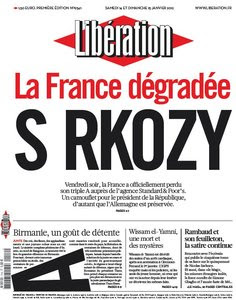A França, que tinha a classificação de AAA, perdeu um A, tirado pela Standard & Poor's, como confirma a capa do Libération.
